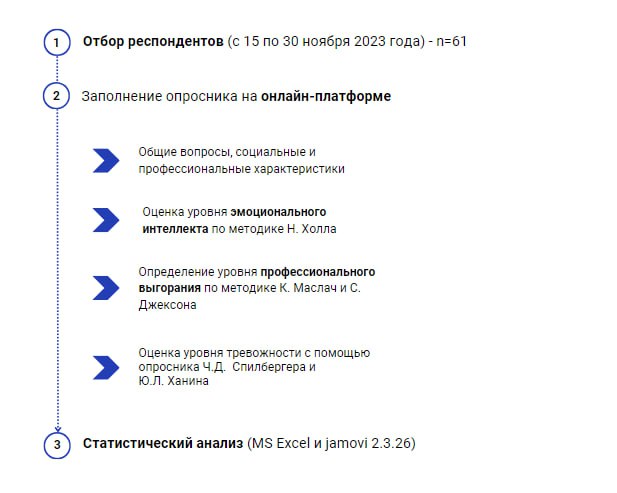 Материал и методы. Исследование выполнено в ноябре 2023 года среди курсантов программы обучения «Человекоцентричная модель здравоохранения» инновационной академии профессионального развития «Докстарклаб». Все курсанты – медицинские работники учреждений здравоохранения республики Тыва. Оценка уровня эмоционального интеллекта (ЭИ) проведена по методике Н. Холла, оценка уровня профессионального выгорания – по методике К.Маслач, оценка уровня тревожности исследована с помощью опросника Ч.Д. Спилбергера-Ю.Л.Ханина.